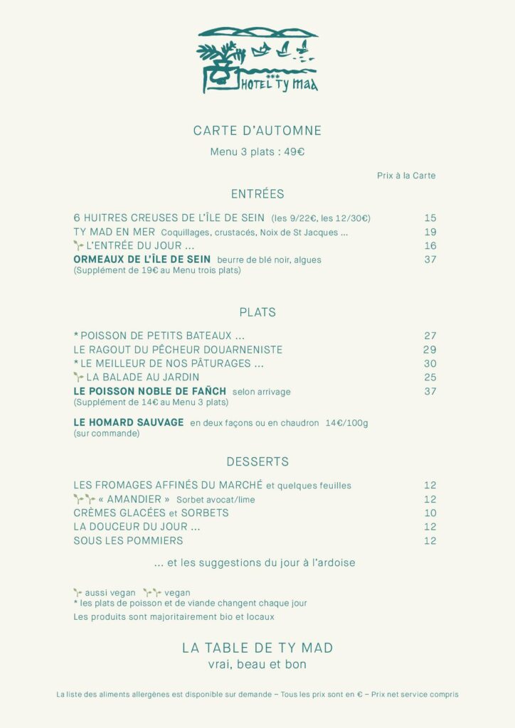 De la terre proviennent les légumes, fruits, graines, farines … issus pour la plupart de l’agriculture biologique locale. Des viandes d’animaux élevés en plein air, achetées au plus prés. De la mer, poissons majoritairement de pêche locale et à la ligne, crustacés du coin. Et les merveilles de la mer, ormeaux, palourdes, huîtres de l’île de Sein. Bar (loup de mer) et poisson noble de ligne de la baie. Homard sauvage, sur commande … le tout, magnifiquement préparé.